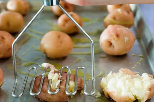 boil the potato's in a pot of water until soft. grase up a cookie sheet with pam spray or olive oil and spread the potato's out like you would when baking cookies. mash and drizzle with the oil.